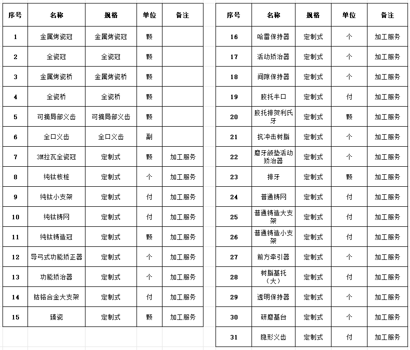 注:上述目录为我院常规使用产品,投标人所投产品完整率不得低于90%。因考虑后期科室发展,义齿产品的多样性,请各位投标人提供本公司全部义齿(含加工服务)产品目录供我院后期选择。