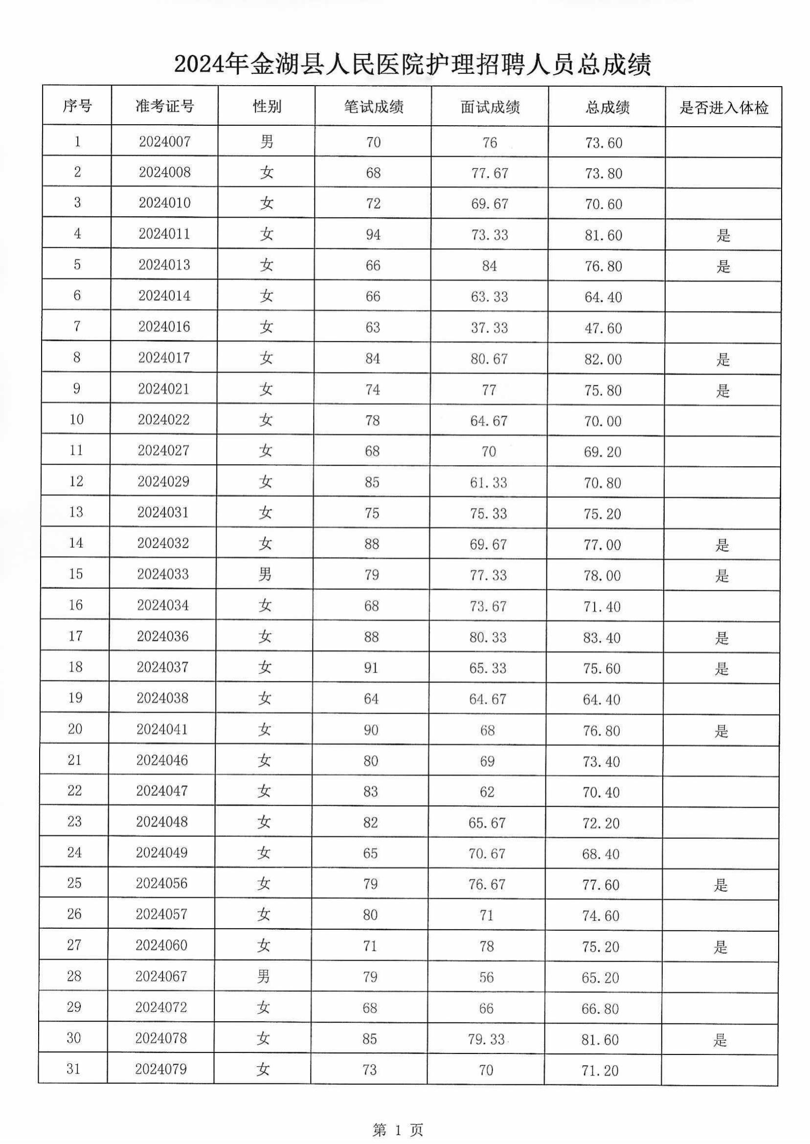 2024年金湖县人民医院护理招聘人员总成绩公示