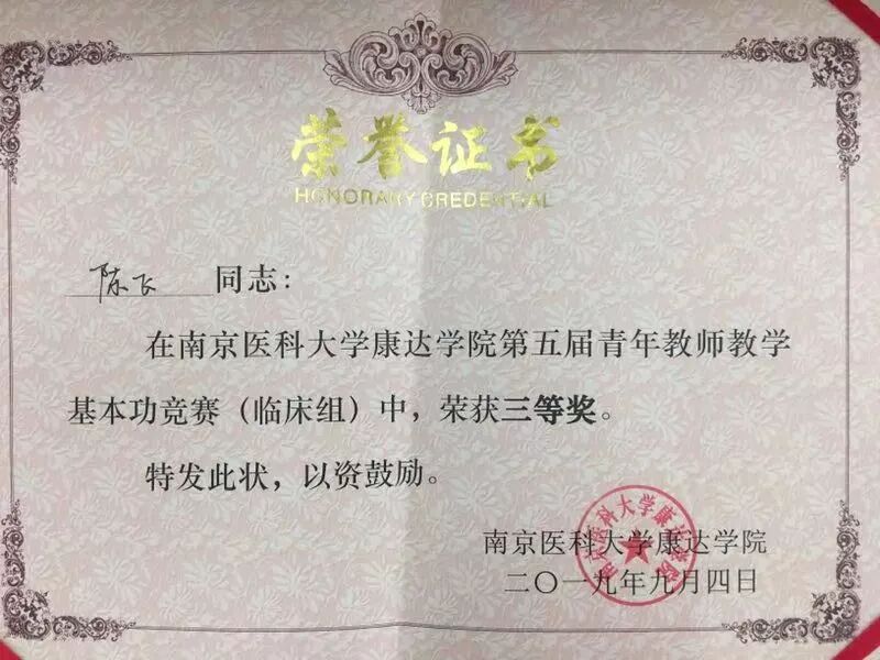 经过激烈的角逐,我院陈飞顺利进入决赛。配合预先准备的PPT等授课材料,陈飞医生以富有创意性的教案内容设计,流利、精准的讲说,赢得了现场评委老师们的一致好评,最终在决赛中取得了“南京医科大学康达学院第五届青年教师教学基本功竞赛(临床组)”三等奖的好成绩。